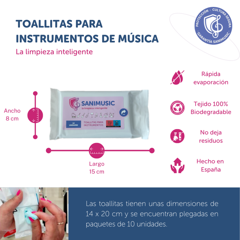 Con las toallas de Sanimusic podrás limpiar en segundos la saliva de tu instrumento. Garantía Sanimusic Sanimusic es tu marca de confianza para soluciones específicas para la actividad musical.